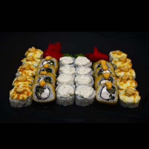 Состав: 1/2 Филадельфия с огурцом, 1/2 Флорида с лососем, 1/2 Ролл Царский(рис,нори,сыр сливочный,лосось, креветка,перец болгарский, огурец,темпура,соус унаги), 1/2 Ролл Гуффи (рис,нори,сыр сливочный,огурец,тунец,соус унаги+соус ореховый), 1/2 запеченый с лососем(рис,нори,сыр сливочный,огурец,соус для запекания, лосось, масаго), 1/2 запеченый тунец(рис,нори,сыр сливочный,огурец,соус для запекания,тунец,масаго) Имбирь-3шт Васаби-3шт Соус соевый-3шт Количество: 32шт Вес: 1000 гр