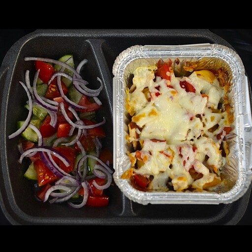 Состав: салат(помидоры, огурцы, лук красный, масло растительное) макарошки с курицей