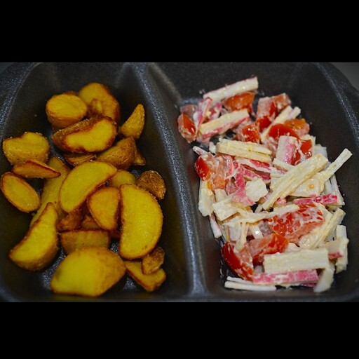 Состав: Картофель по деревенски, салат с томатами и крабом под чесночный соусом Вес: 200 гр Цена: 298 ₽