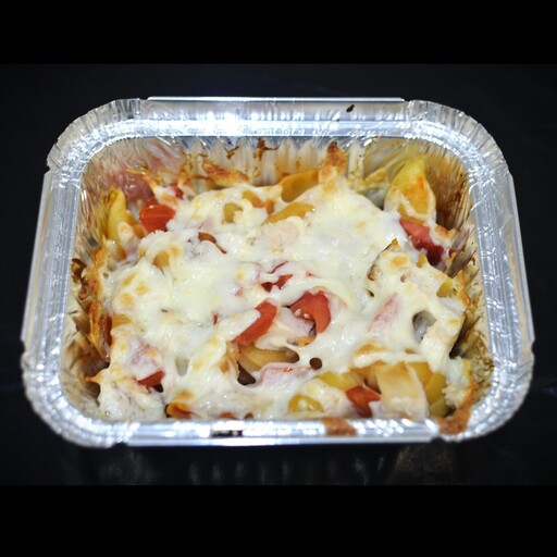 Состав: макароны, сливки+соус для пиццы, курица копченая, помидоры, моцарелла Вес: 250гр