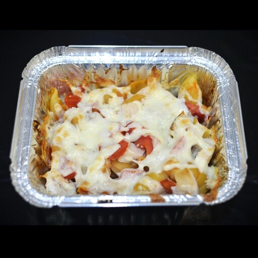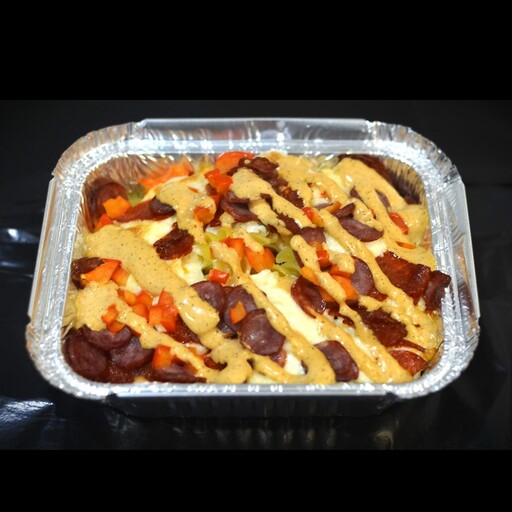 Состав: картофель фри, пепперони, охотничьи колбаски, перец болгарский, соус для запекания, соус спайс Вес: 220гр